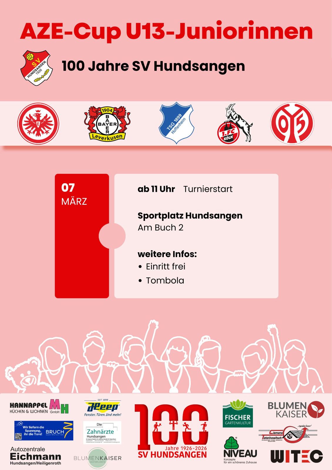 Am Samstag, 7. März ab 11:00 Uhr sind im Rahmen der mittlerweile 4.Ausgabe des AZE-Cups wieder die Nachwuchsteams einiger Bundesligisten zu Gast auf unserer Sportanlage in Hundsangen. Von 11:00 bis 17:00 Uhr rollt der Ball, um den diesjährigen Turniersieger zu ermitteln. Sportinteressierte dürfen sich auf flinken Tempofußball mit allen Zutaten, die den Mädchenfußball auszeichnen, freuen. Dabei darf man gespannt sein, ob es den Hundsängerinnen auch in diesem Jahr gelingt, der TSG Hoffenheim, Eintracht Frankfurt, Bayer Leverkusen oder Mainz 05 Paroli zu bieten. Gegen den erstmals teilnehmenden 1. FC Köln werden …