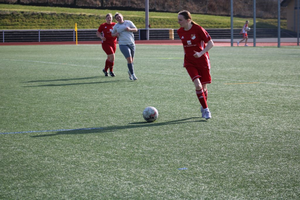 Es begann das erste Rückrundenspiel und man merkte den Spielerinnen beider Mannschaften an, dass da noch nicht alles passte. Stellungsspiel, Technik und Zuordnung waren noch ausbaufähig. Letztendlich entwickelte sich ein Spiel zwischen den Strafräume ohne wirkliche Großchancen zu generieren. In der 16. Minute schickte Albijona unsere heutige Stürmerin Marie R. steil, die frei vor dem Tor souverän einschob. Die Freude hielt aber nur 2 Minuten ehe Rheinbreitbach quasi im Gegenzug mit einem sehr ähnlichen Spielzug ihrer beider erwähnten Spielerinnen ausgleichen konnte. So ging es denn auch Unentschieden in die Pause.